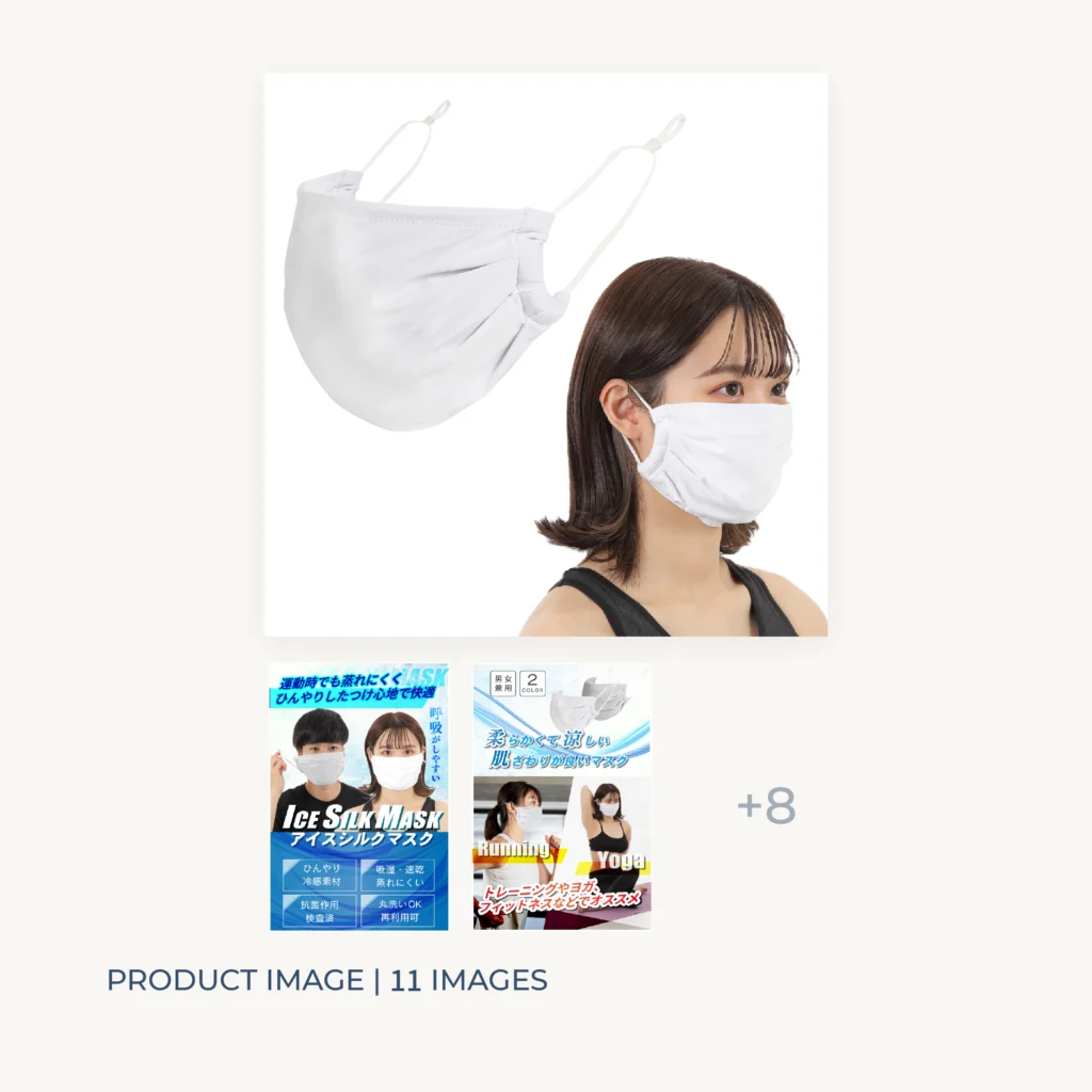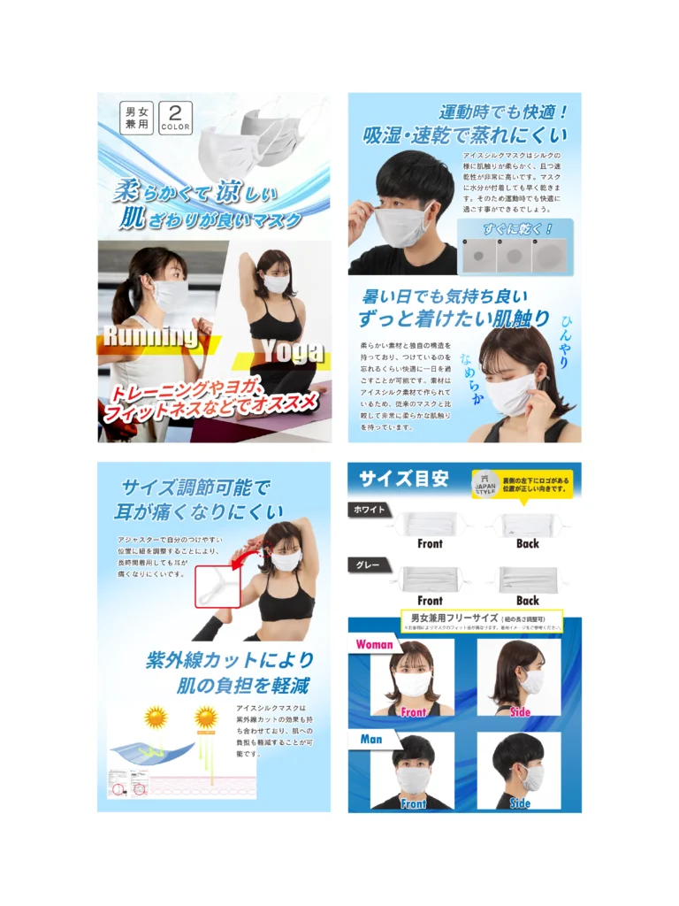 Amazon商品画像制作|冷感マスクBy makimari / 2026年1月25日 Amazon商品画像制作|冷感マスク 運動時の着用を想定した「アイスシルクマスク」のAmazon販売用 商品画像一式を制作しました。涼しさ・蒸れにくさ・肌触りの良さといった、写真だけでは伝わりにくい機能性を、視覚的に分かりやすく伝えることを重視しています。 制作種別:Amazon商品画像 制作枚数:全11枚(メイン6/詳細5)(代表的な画像のみを掲載しています。) 制作期間:約8日 担当範囲:構成設計/デザイン 使用ツール:illustrator/Photoshop 課題・ご要望 スポーツ・ヨガ・ランニングなど、「動くシーン」での使用価値が伝わりにくい吸湿速乾・抗菌・UVカットなど、機能が多く、情報が散らばりやすいAmazon販売のため、短時間の閲覧でも特徴・安心感・使い方が理解できる構成が必要 構成・デザインの工夫 使用シーンを先に提示 着用イメージを冒頭に配置し、運動時の快適さや機能性を一目で伝わる構成で設計しました。 機能訴求について 吸湿速乾・抗菌・UVカットといった機能は、図解・アイコン・強調コピーを用いて直感的に理解できるよう設計しています。 情報の優先順位 サイズ感・調整機能・洗濯方法など、 購入前に不安になりやすいポイントは後半で丁寧に補足し、画像だけで疑問が解消できる構成を意識しました。 ※本案件は実務として制作したものです。 現在は、よりブランドやターゲットに合わせたトーン設計・構成提案を重視した商品画像制作を行っています。 同じような制作、ご相談ください 同様のLP制作をご検討の方は、目的やご予算に合わせてご提案可能です。お気軽にご相談ください。 無料で相談をする 制作実績一覧に戻る Prev 次の実績Next